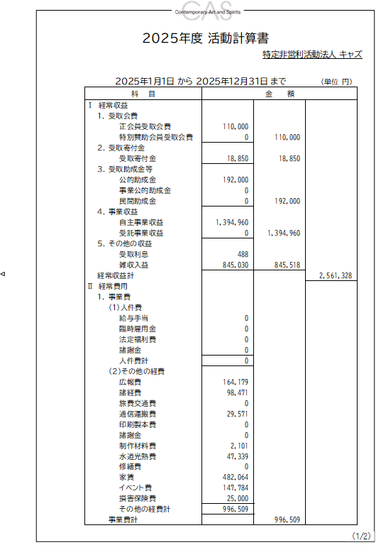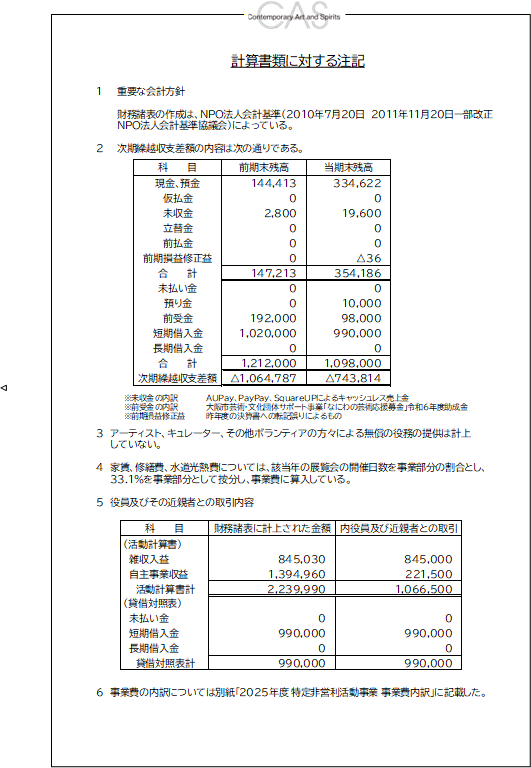 事業報告書(1,2,3,4)、財産目録、貸借対照表、活動計算書(1,2)、注記書類、事業収支内訳 |