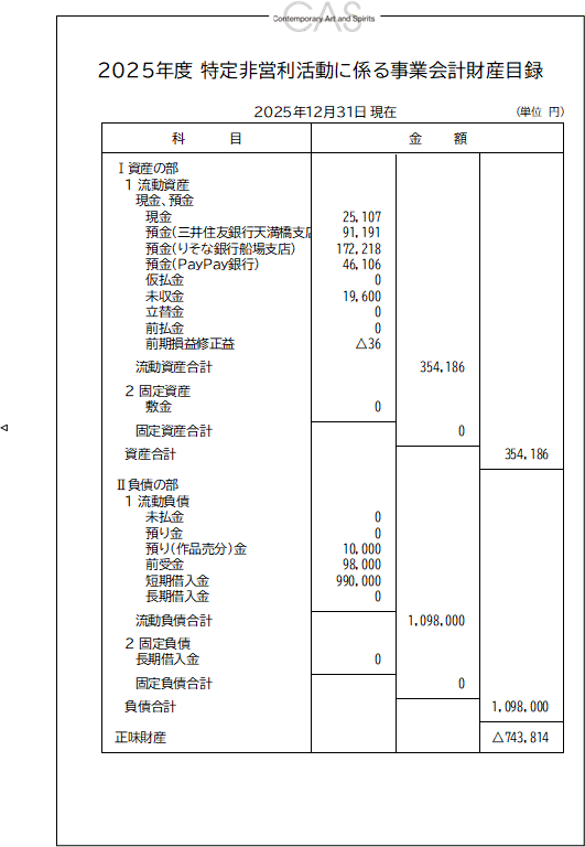 事業報告書(1,2,3)、財産目録、貸借対照表、全収支計算書、事業収支内訳 |